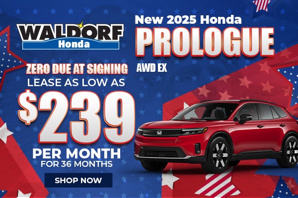 Expiration Date 03/02/2026. Annual Miles 10,000. Available to current owners of any newer Honda, Chevrolet, Ford, GMC, Hyundai, Jeep, Kia, Mazda, Nissan, RAM, Subaru, Tesla, Toyota and Volkswagen vehicles. Includes down payment, no security deposit; excludes tax, title, license and dealer fees. For well-qualified customers. *Offer excludes accessories and premium paint color. Closed-end lease for 2025 Prologue AWD EX available through 3/2/2026, to approved lessees or purchasers by Honda Financial Services. Lease or Finance offer only available to current qualified owners of any 2011 or newer Honda or any of the competitive brands listed above. MSRP $50,995.00 (includes destination; excludes tax, title, license, registration, options, insurance). Actual net capitalized cost $28,951.63. Total monthly payments $9,324.00. Option to purchase at lease end $23,457.70. Monthly payment/total due at lease signing calculated with $3,500.00 LOYALTY or CONQUEST AWARD AMOUNT toward cap cost reduction or down payment assistance. Lessee responsible for maintenance, excessive wear/tear and up to 20¢/mi. over 10,000 miles/year. Offer cannot be combined with $0 Due at Lease Signing or Certified Pre-Owned Financing. Conquest & Loyalty offers cannot be combined. Dealer participation may affect actual payment. Dealer sets actual prices. See participating dealers for complete details.