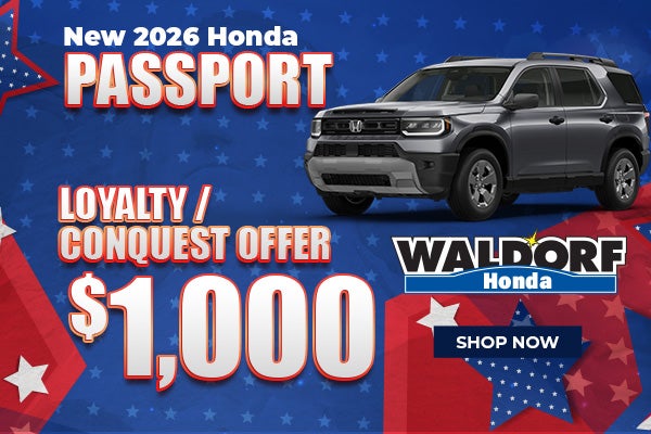 Expiration Date 03/02/2026. $1,000 toward the lease/finance of a new 2026 Passport vehicle. Available to current owners of any 2011 or newer Honda, Chevrolet, Ford, Hyundai, Jeep, Kia, Mazda, Nissan, Subaru, Tesla, Toyota and Volkswagen vehicles. Eligible through 3/2/2026. $1,000 toward Cap Cost Reduction or Down Payment Assistance with the lease/finance of a new and not previously reported sold 2026 Passport to qualified current owners of any 2011 or newer Honda or any of the competitive brands listed above. Must provide proof of ownership of eligible vehicle in the form of a current vehicle registration or proof of valid auto insurance. No trade-in required. Offer excludes purchases made prior to the program period and is transferable among members of the same household when the retail delivery registration address matches the current address of the proof of ownership document. Not redeemable for cash. Incentive paid to dealer and requires dealer participation. Not all customers will qualify. See dealer for details.