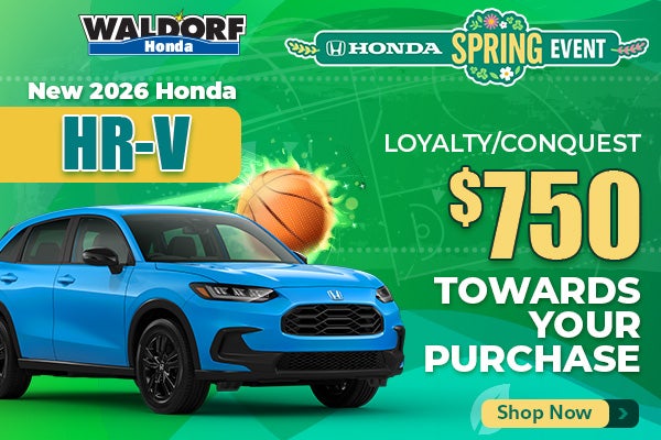 Expiration Date 04/30/2026. $500 toward the lease/finance of a new 2026 HR-V vehicle. Available to current owners of any 2011 or newer Honda, Chevrolet, Ford, Hyundai, Jeep, Kia, Mazda, Nissan, Subaru, Tesla, Toyota and Volkswagen vehicles. Eligible through 3/2/2026. $500 toward Cap Cost Reduction or Down Payment Assistance with the lease/finance of a new and not previously reported sold 2026 HR-V to qualified current owners of any 2011 or newer Honda or any of the competitive brands listed above. Must provide proof of ownership of eligible vehicle in the form of a current vehicle registration or proof of valid auto insurance. No trade-in required. Offer excludes purchases made prior to the program period and is transferable among members of the same household when the retail delivery registration address matches the current address of the proof of ownership document. Not redeemable for cash. Incentive paid to dealer and requires dealer participation. Not all customers will qualify. See dealer for details.