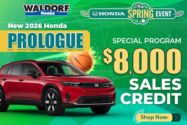 Expiration Date 03/31/2026. Sales Credit towards the lease or purchase of a new 2026 Prologue but cannot be provided directly to the customer as cash or a rebate. Eligible through 3/2/2026. $6,000 towards Cap Cost Reduction with a lease, Down Payment Assistance with a financed purchase, or sale price with a cash purchase of a new and not previously reported sold 2026 Prologue. Cannot be combined with special APR financing or special lease incentives, zero-due down, certified pre-owned financing or certain American Honda Finance Corporation lease/finance cash offers. Not redeemable for cash. Not all customers will qualify. Incentive paid by American Honda Motor Co., Inc. See participating dealers for details.